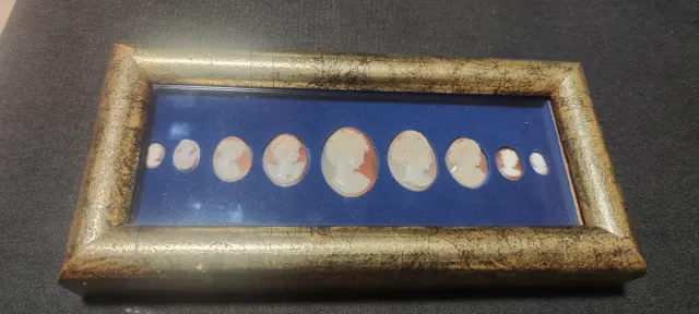 Cornice decorativa con una serie di nove cammei incastonati su sfondo blu. - Nove cammei di diverse dimensioni. - Sfondo in tessuto blu. - Cornice in legno dorato.