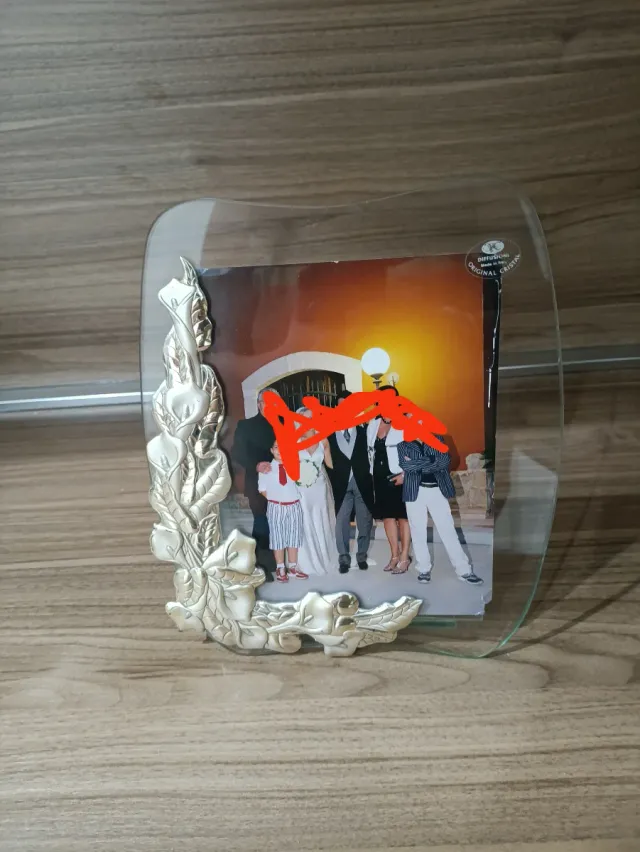 Elegante cornice in cristallo con decorazioni in argento. - Design floreale con foglie e fiori. - Bordi arrotondati in cristallo. - Base stabile per appoggio.