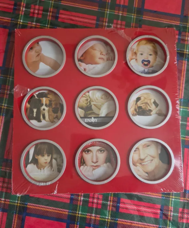 Cornice portafoto rossa, perfetta per esporre i vostri ricordi più belli.Mis.23x23 .Nuova,imballata. - Design moderno con nove aperture circolari. - Colore rosso .