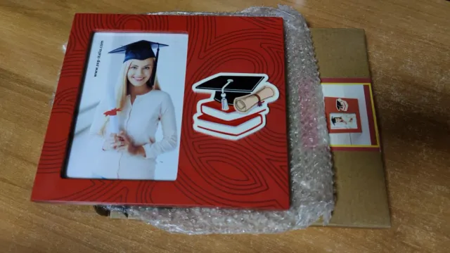 Dettagli del prodottoCornice rossa a tema laurea, con un'illustrazione di un cappello da laureato e una pergamena.