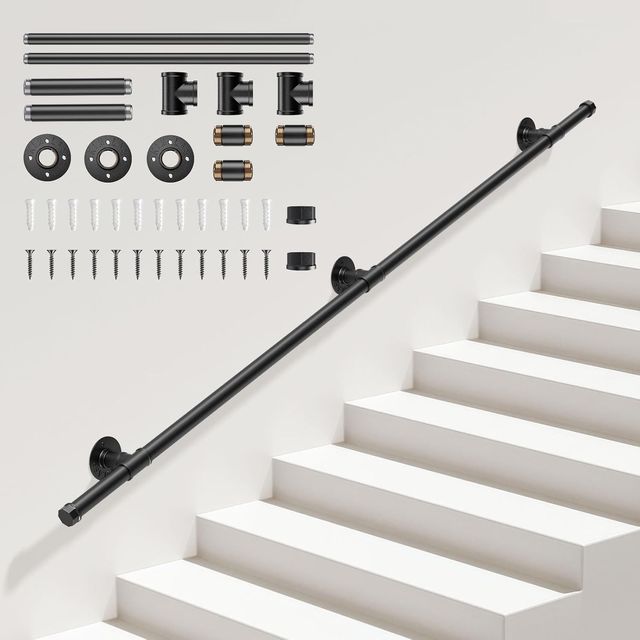 Corrimano in stile industriale per scale interne, completo di tutti gli accessori per il montaggio.