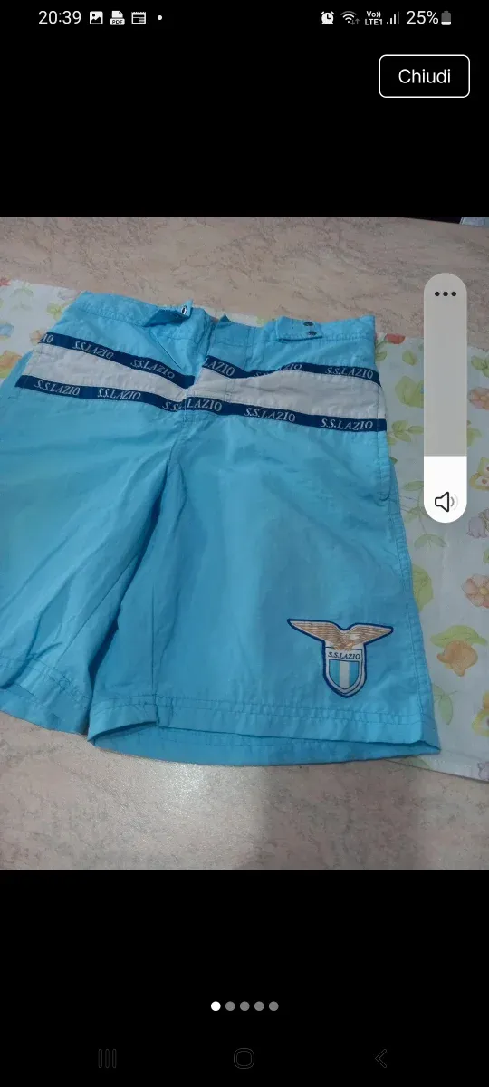 Costume da bagno per bambino con logo SS Lazio. - Colore azzurro. - Fasce bianche e blu con logo ripetuto. - Stemma SS Lazio sul lato destro.