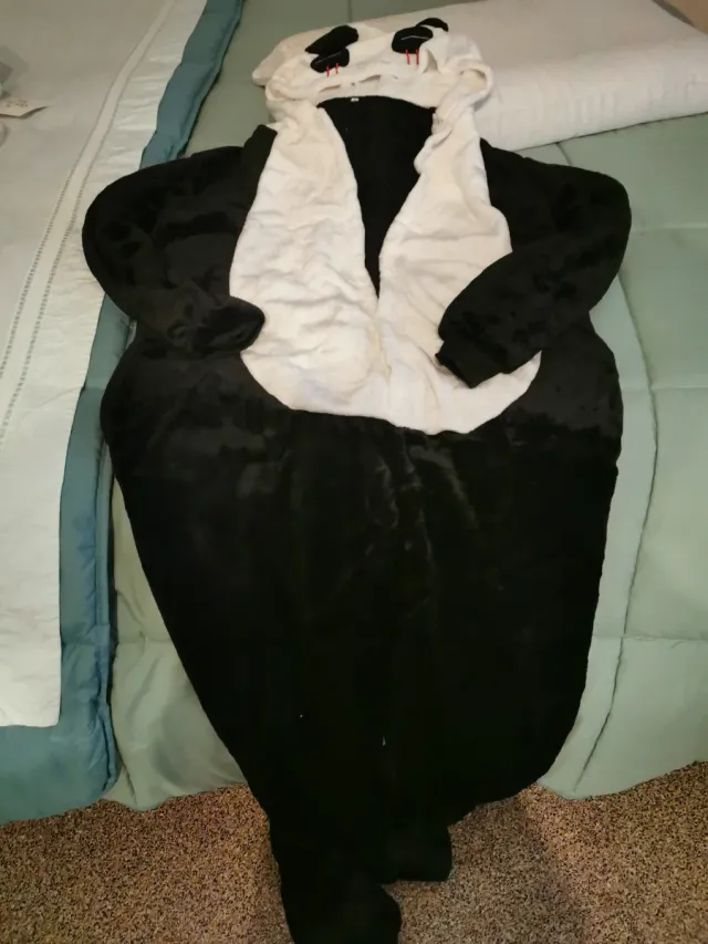 Morbido costume da panda in peluche, perfetto per travestimenti o serate a tema. - Design a tuta intera. - Cappuccio con dettagli da panda. - Materiale in peluche.
