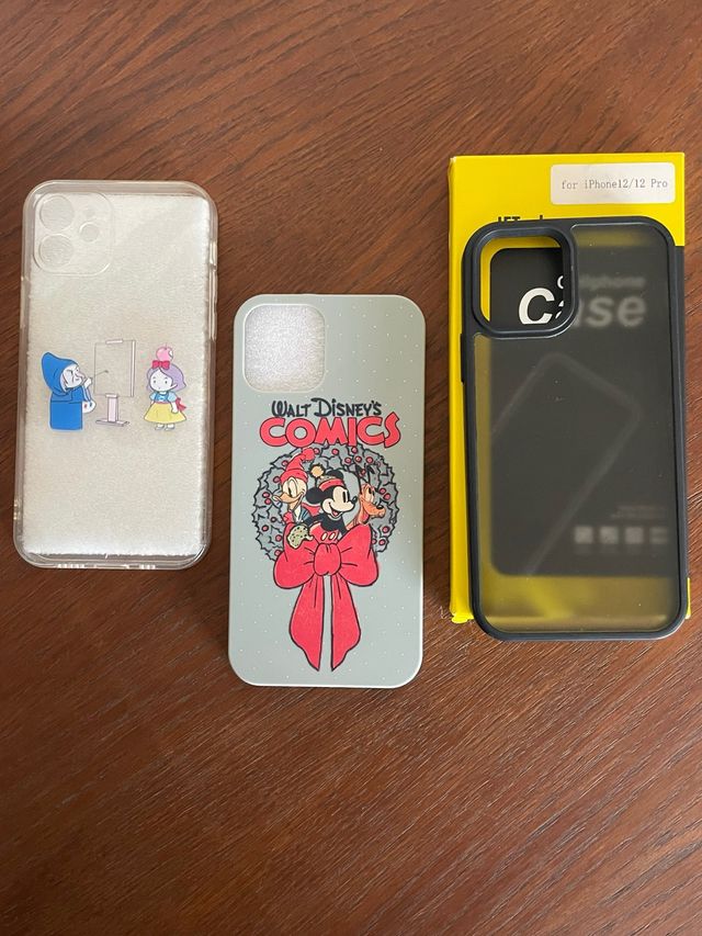 Set di tre cover per iPhone 12/12 Pro. - Cover trasparente con disegno. - Cover grigia con stampa Walt Disney's Comics. - Cover nera JEtech