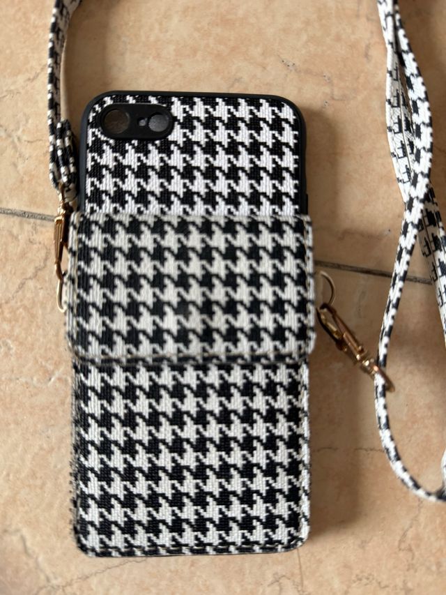 Vendo cover per iPhone con motivo bianco e nero. Dotato di un pratico laccio per portarlo a tracolla e tasca per tessere. Cover per iPhone 7, 8, SE2020, SE2022
