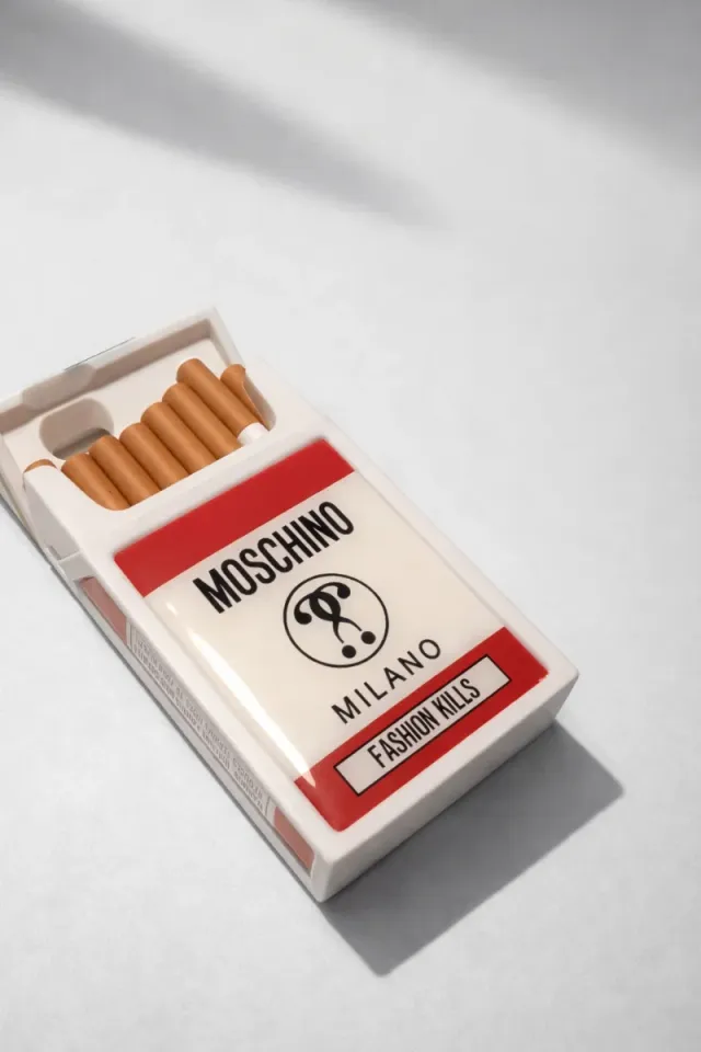 Cover originale Moschino Milano dal design iconico e provocatorio, realizzata a forma di pacchetto di sigarette con la celebre scritta “Fashion Kills”.