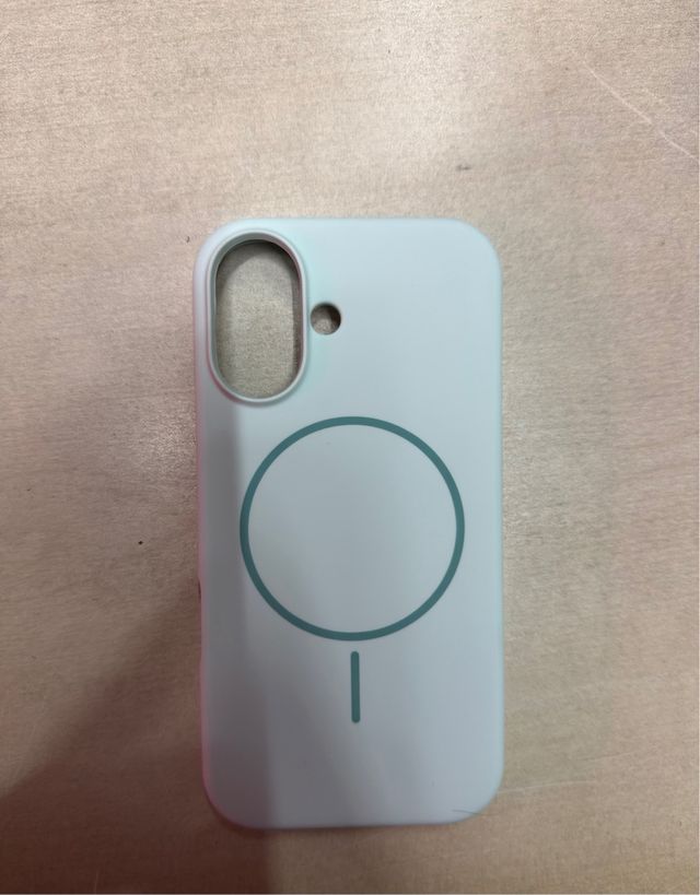 Cover per iPhone di colore azzurro chiaro, con design compatibile MagSafe. - Foro per fotocamera. - Cerchio centrale per MagSafe.