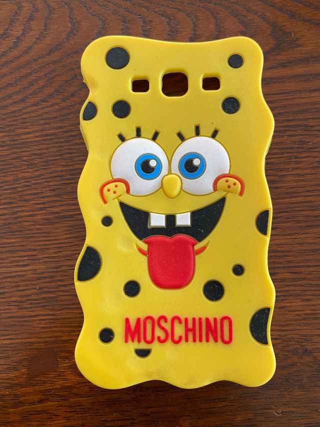 Cover per Samsung S3 con design di Spongebob e logo Moschino. - Materiale in gomma gialla. - Dettagli neri e rossi. - Forma sagomata a Spongebob.