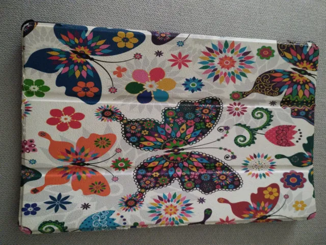Cover per tablet M10 con un vivace design a farfalle e fiori colorati. - Fantasia floreale con farfalle. - Motivo multicolore su sfondo bianco.