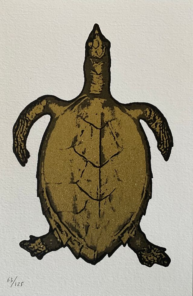Serigrafia molto particolare materica con glitter dorato che cambia colore in base al riflesso della luce