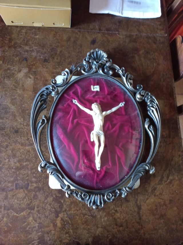 Crocifisso su base di velluto ovale con cornice in bronzo e vetro bombato a protezione misure esterne cm 40 x cm 33.