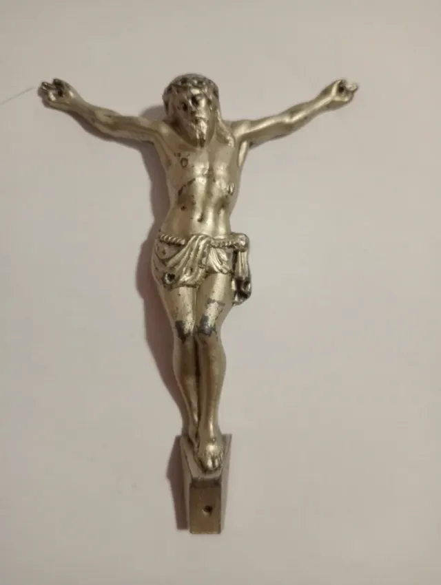 Bellissimo crocifisso vintage realizzato in metallo. Alto 9,5 cm, largo 7 cm. - Design classico e dettagliato. - Materiale metallico resistente.