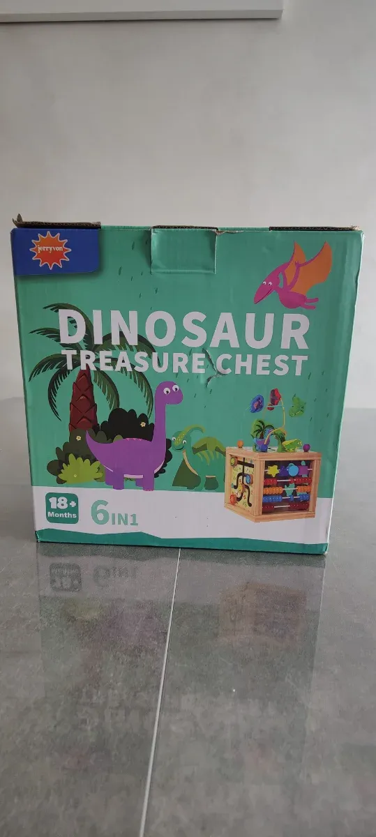 Cubo di attività a tema dinosauri, ideale per i più piccoli. - 6 diverse attività di gioco. - Design colorato con illustrazioni di dinosauri.