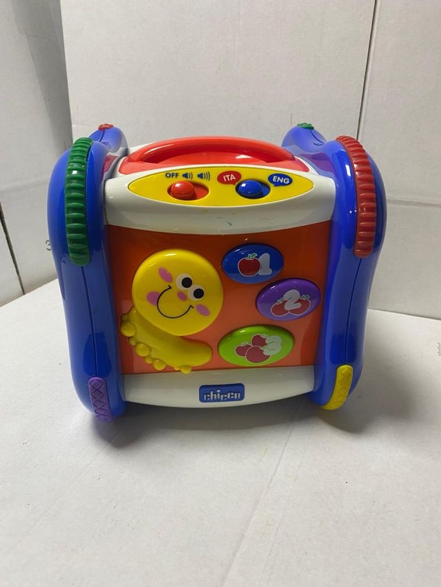 Cubotto Chicco interattivo con tante attività. - Pulsanti colorati. - Immagini divertenti. - Maniglia per il trasporto.