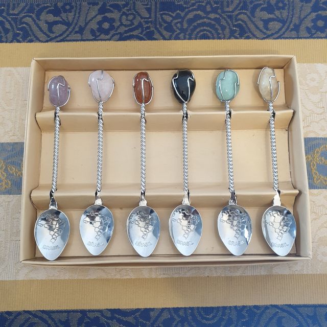 6 cucchiai di zucchero ritorti con pietre preziose, 11 cm circa ,prodotte in Brasile. made brasil