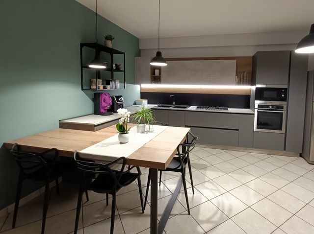 Dettagli del prodottoCucina ARREDO3 color grigio chiaro effetto cemento, antracite opaco e effetto legno, di un anno di vita per cui praticamente nuova.