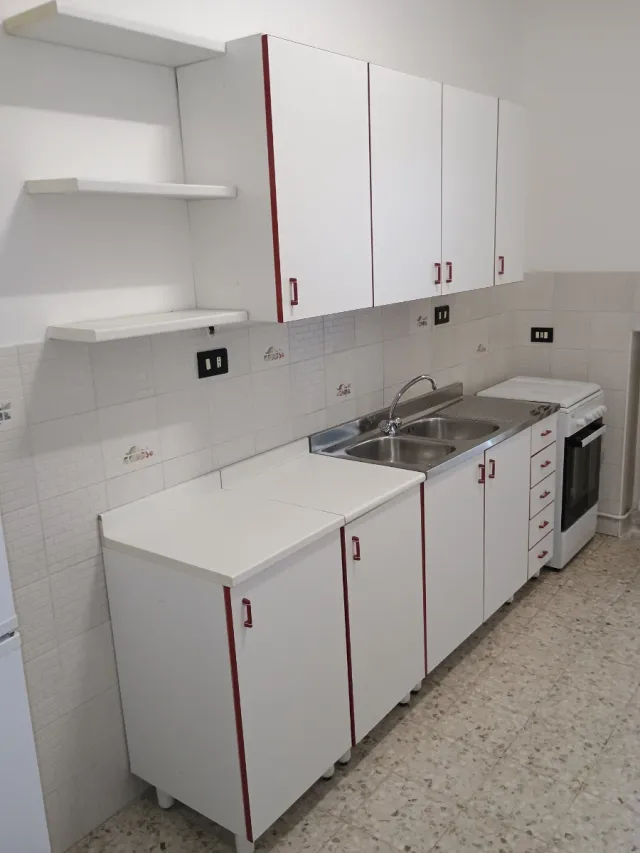 Cucina componibile bianca con dettagli rossi