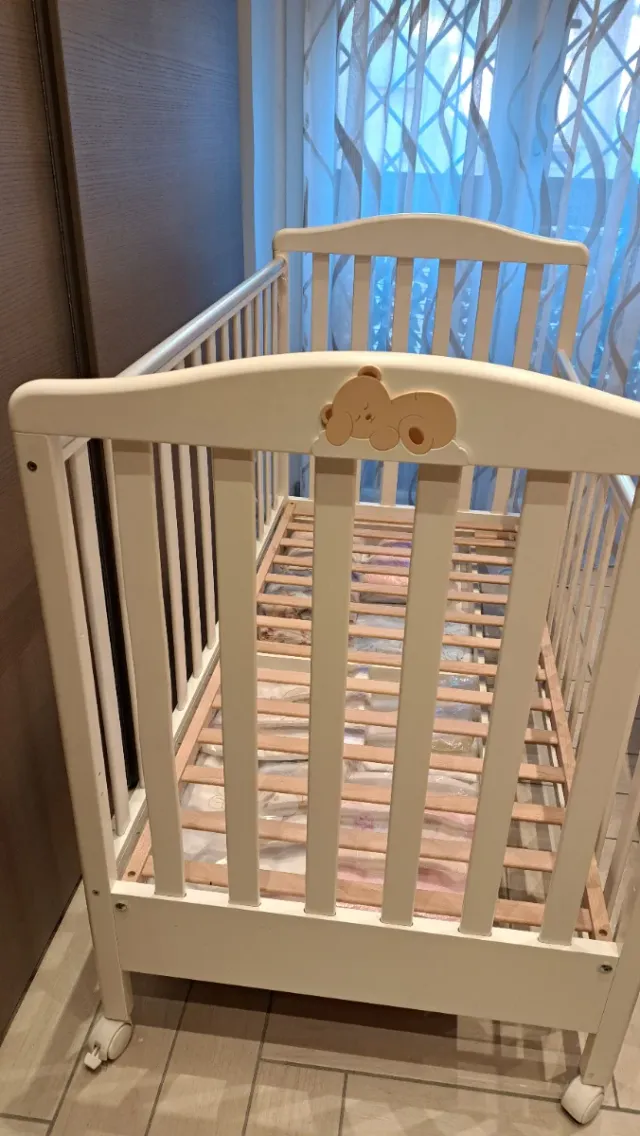Culla in legno di marca Azzurra, ideale per i più piccoli. Presenta un simpatico orsetto decorativo. - Struttura in legno bianco. - Ruote per facilitare lo spostamento.
