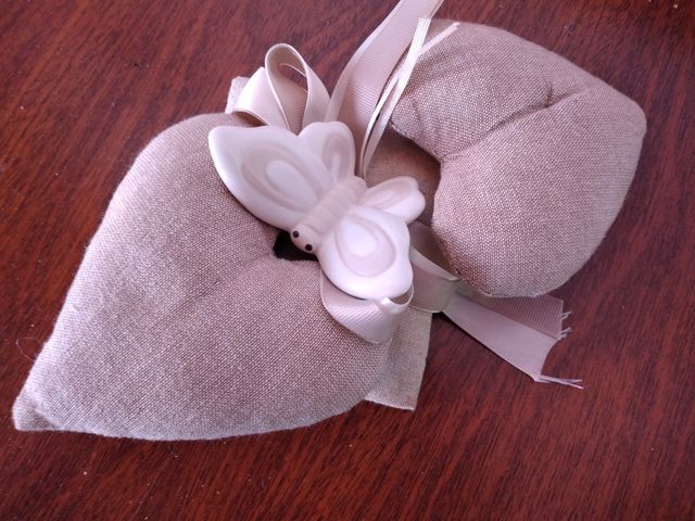 Dettagli del prodotto2 cuori in stoffa color tela ed una farfalla in ceramica su un letto di tela Misure del prodotto
