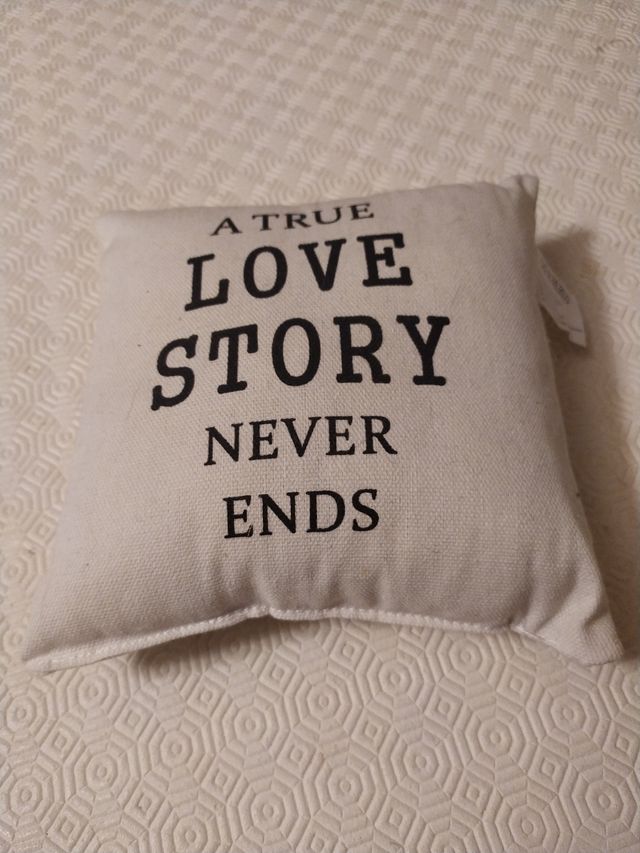 Piccolo cuscino con scritta romantica in poliestere e cotone.