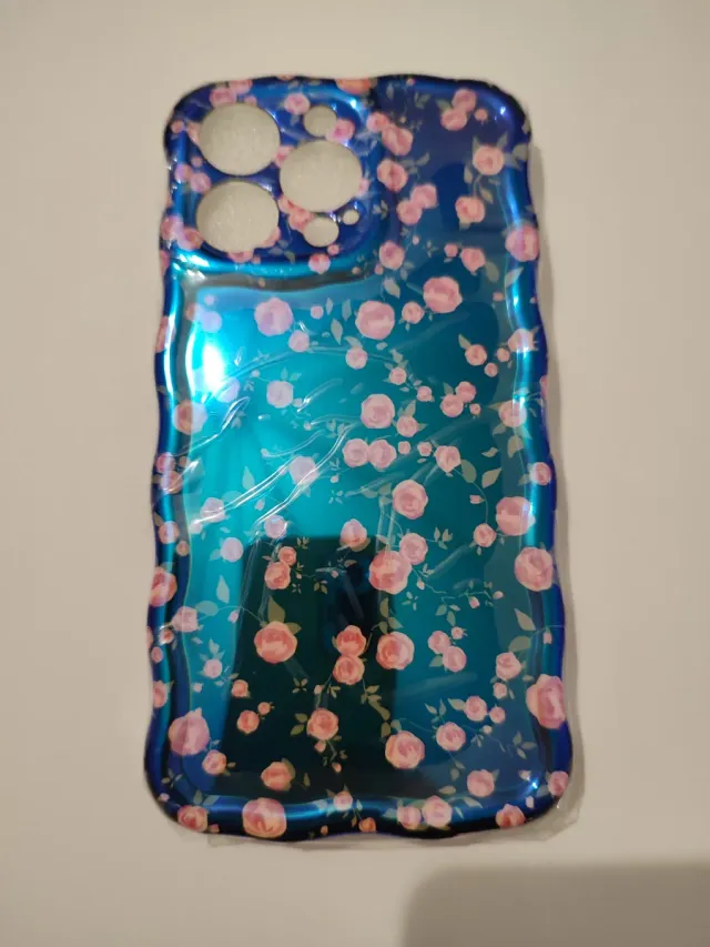 Dettagli del prodottoCustodia protettiva con un design floreale su sfondo blu cangiante.