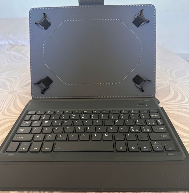 Cover universale per tablet fino a 11" e Apple iPad Air 11" M2/Pro M4 con tastiera integrata Wireless. I quattro ganci interni regolabili bloccano il tablet creando un ancoraggio perfetto. Il lato posteriore ha un supporto per la funzione di stand up e la copertina presenta una chiusura magnetica. L'interno, vellutato, protegge il tablet da eventuali graffi. Batteria della tastiera Bluetooth al litio.