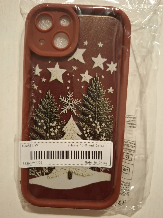 Dettagli del prodottoCustodia per iPhone 13 con un design natalizio. Presenta un motivo di alberi di Natale, stelle e fiocchi di neve su sfondo bordeaux.