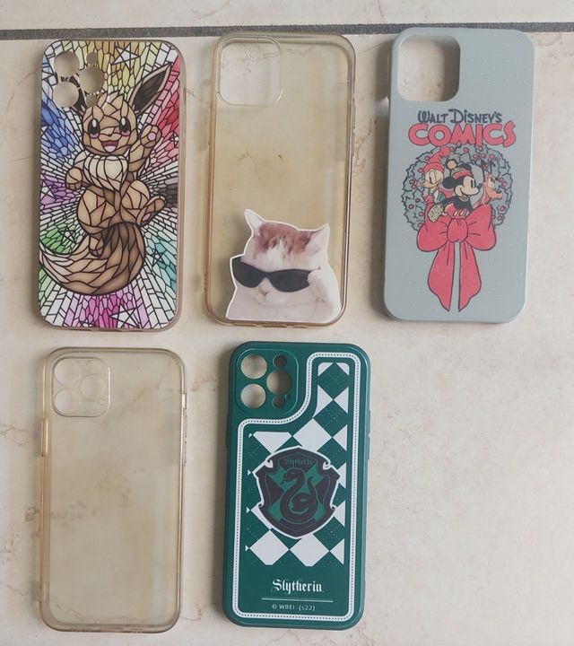 Dettagli del prodottoVendo 5 custodie per iPhone 12 Pro, in buone condizioni. Sono tutte trasparenti o semitrasparenti, tranne una verde scuro con stemma di Serpeverde. Una custodia presenta un'immagine di Pikachu, un'altra un gatto con occhiali da sole. - 5 custodie totali