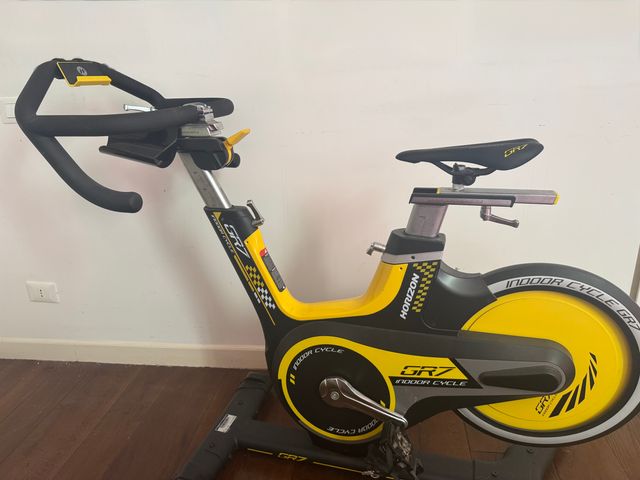 Dettagli del prodottoIndoor Cycle professionale Serie GR7 Horizon in ottime condizioni, ideale per allenamenti a casa. Ritiro autonomo a Roma. Concepita per dare la reale sensazione del ciclismo su strada con sistema di resistenza magnetica, manubrio e sellino regolabili sia in verticale che orizzontale, pedali con attacco rapido e tradizionale con gabbie. Telaio solidissimo con un peso di 51 Kg e portata massima fino a 136 Kg.