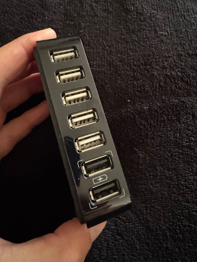 Hub USB nero con 7 porte. - Design compatto e sottile. - Ideale per espandere le porte USB del tuo computer. - Una porta presenta il simbolo di ricarica.