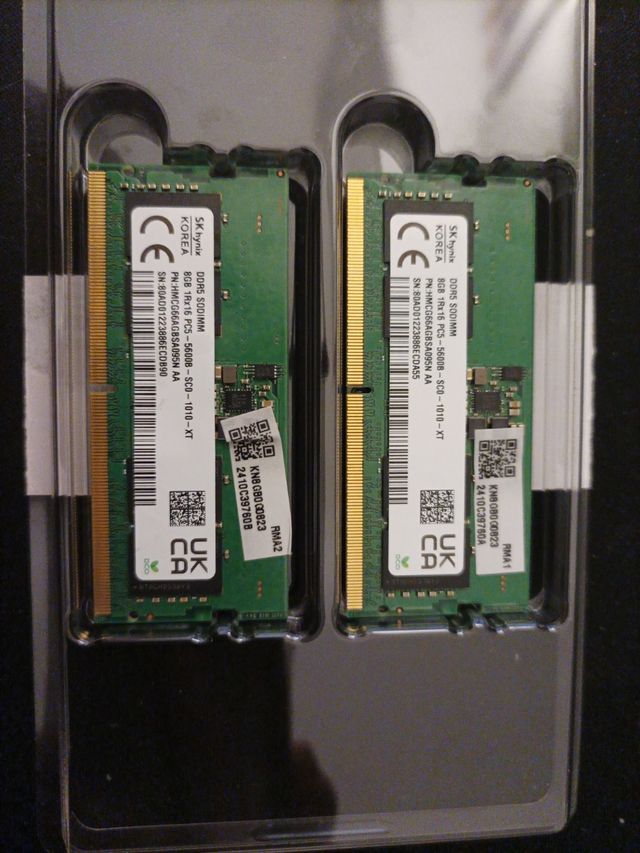 2 moduli RAM SODIMM per Notebook DDR5 5600MHz da 8GB per un totale di 16GB. Perfettamente funzionanti, sostituite solo per passaggio a 32GB.