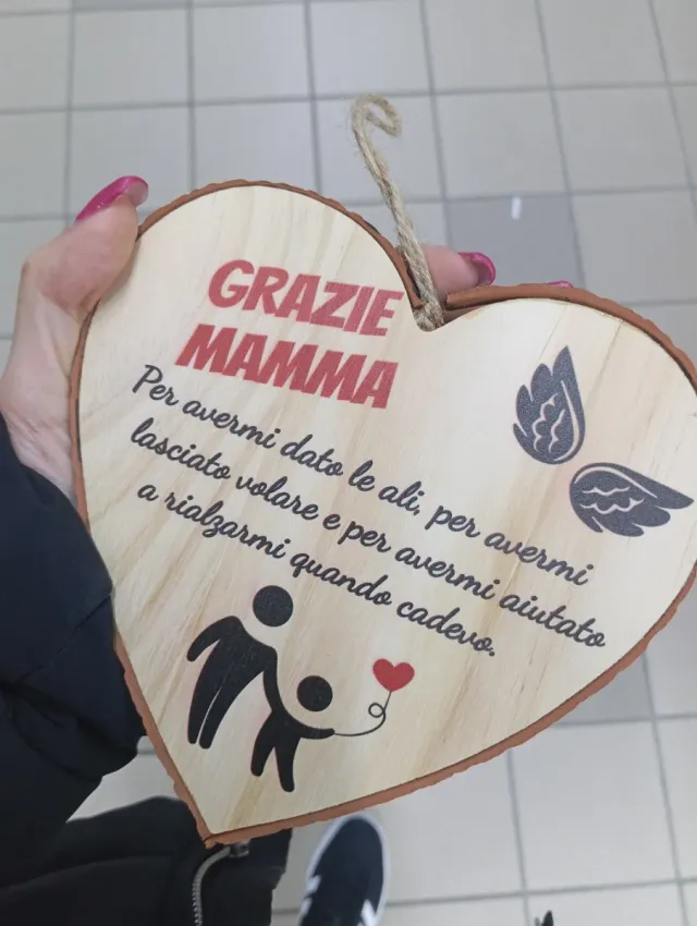 Dettagli del prodottoDecorazione a forma di cuore in legno con una dolce dedica alla mamma.