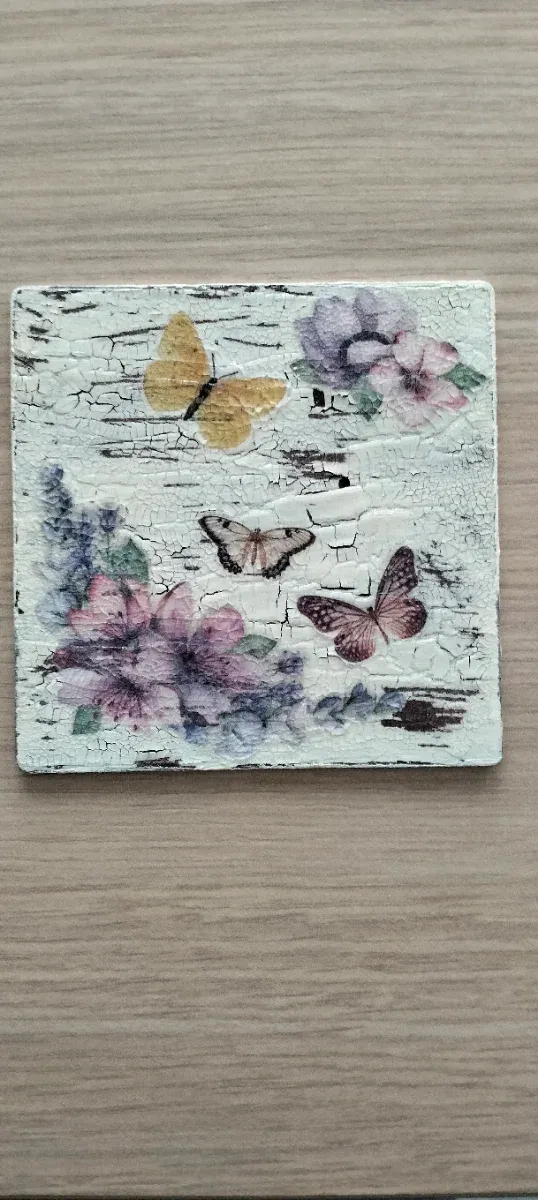 Deliziosa decorazione in legno con un design shabby chic, arricchita da immagini di farfalle e fiori.