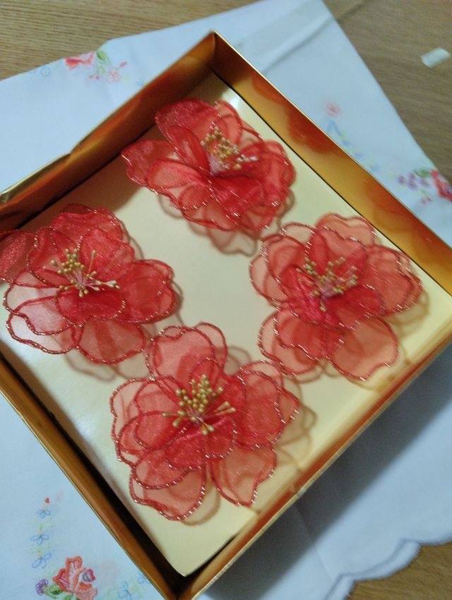 Dettagli del prodottoFiori in tulle arancione molto versatili, possono decorare l'albero di natale,la tavola ma possono essere utilizzati per altre occasioni.Molto vistosi e decorativi. Nuovi, ancora nella loro scatola originale. la scatola in un angolo è un po' ammaccato.