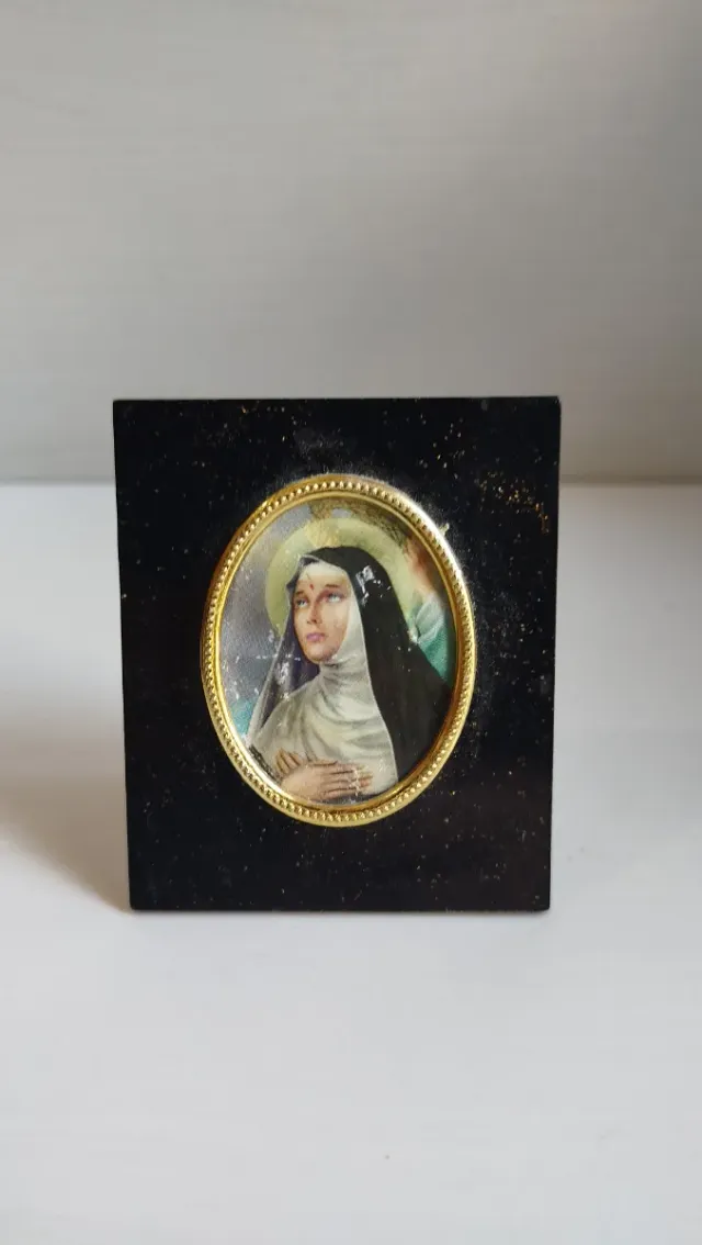 Piccola decorazione religiosa con immagine sacra. - Cornice ovale dorata. - Base quadrata nera.