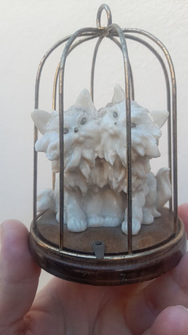 Deliziosa decorazione vintage raffigurante due gattini in una gabbietta. - Materiale: ceramica e metallo. - Base in legno. - Design unico e dettagliato.