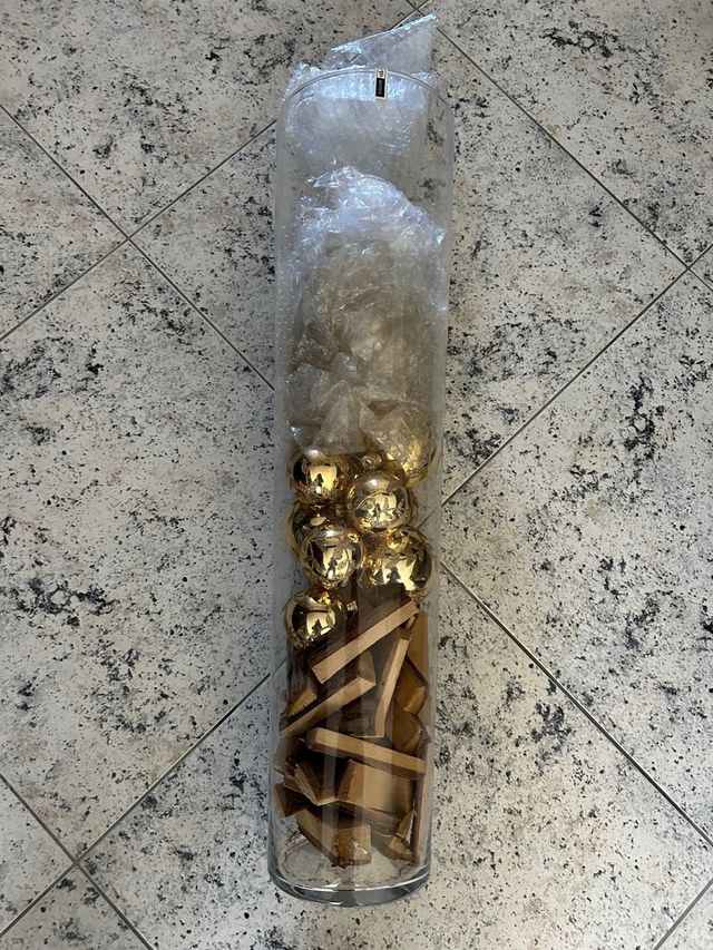 Vaso decorativo natalizio, contenente palline di Natale e pezzi di legno, nuovo, fragile