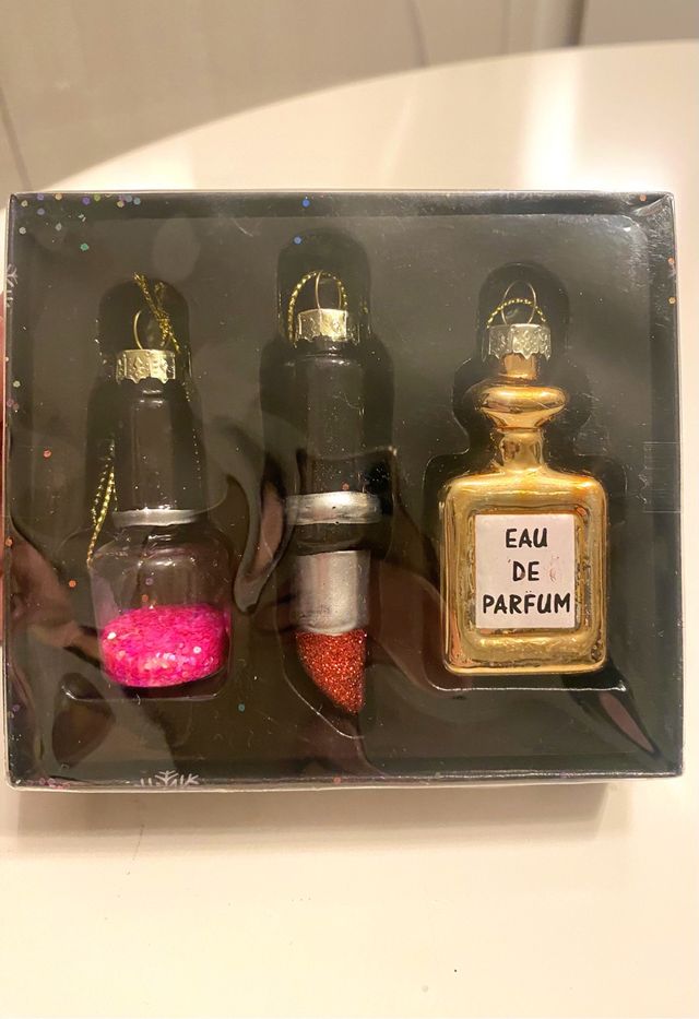 Set di tre pezzi decorazioni natalizie rappresentano: Uno smalto 💅 Un rossetto 💄 Un profumo💐 Ancora nella confezione originale, idee regalo 💝