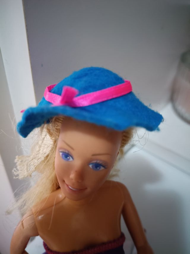 grazioso cappello blu decorato con un nastro rosa. Scarpe borse ecc 3 euro l uno.i bijoux 15 euro - Cappello in feltro blu. - Nastro rosa. - Capelli biondi.