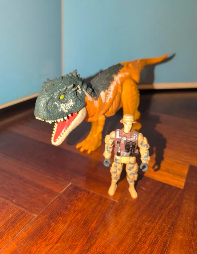 Set composto da un dinosauro stile Jurassic World e una action figure di un soldato. - Dettagli realistici sul dinosauro. - Action figure con accessori.
