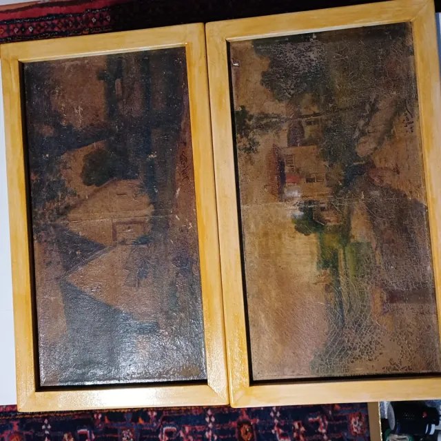Due dipinti antichi raffiguranti scene di campagna con capanne. - Cornici in legno. - Tecnica pittorica a olio.