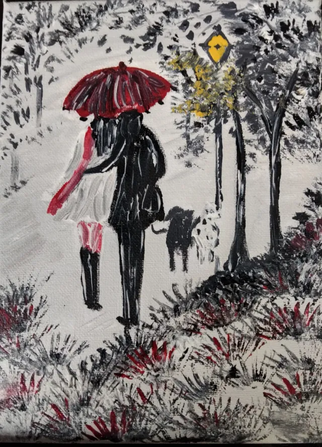Dettagli del prodottoDipinto originale realizzato su tela con colori acrilici. L'opera raffigura una coppia che passeggia sotto un ombrello rosso, con un cane al guinzaglio, in un parco.