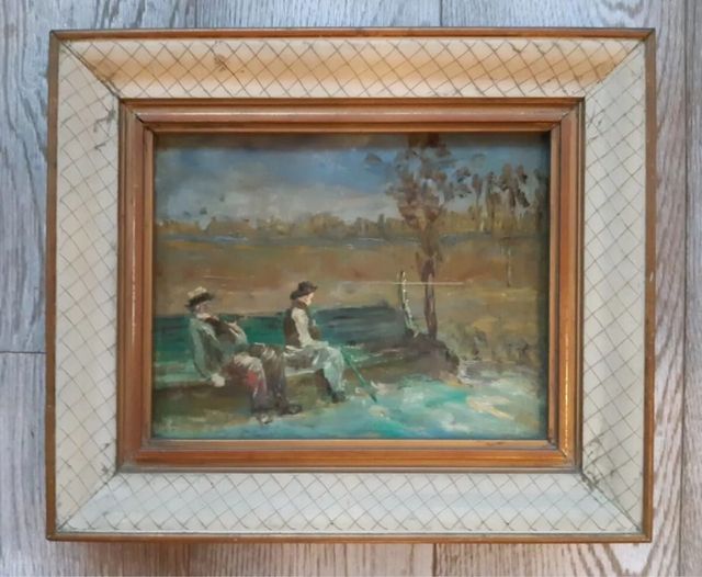 Dettagli del prodottoDipinto ad olio del 1900 con cornice coeva; sono raffigurati due uomini seduti su una panca, paesaggio autunnale Misure del prodotto