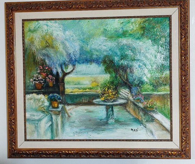 Dettagli del prodottoQuadro dipinto a mano in olio su tela dell'apprezzato artista e maestro Aldo Mari, con firma, cornice artigianale intarsiata in legno dorato, misure:larghezza 81cm, altezza 71cm, condizioni eccellenti. Misure del prodotto