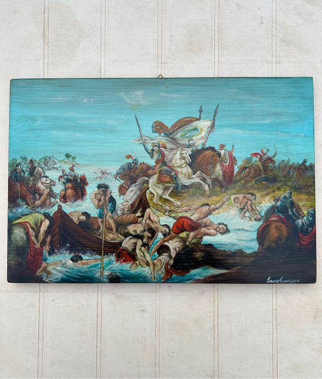 Dettagli del prodottoDipinto su tavola di legno con scena della battaglia di Vaprio d’ Adda (1521)