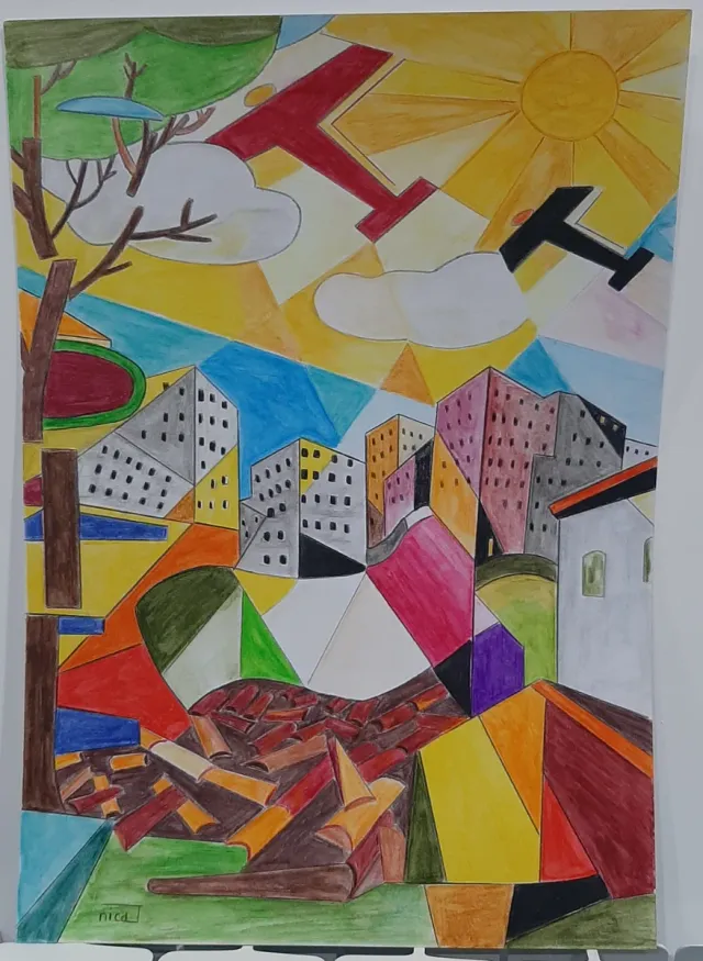 Opera d'arte in stile futurista, rivisitazione Giulio D'Anna. Tecnica mista matite e acquerello su cartoncino 350 gr/m, cm 30x40 circa.