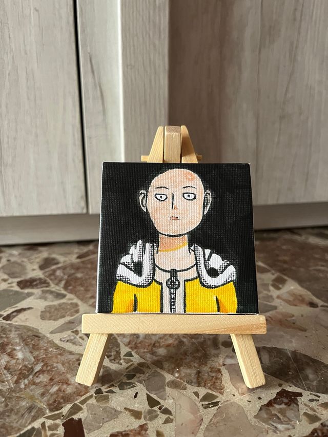 Dettagli del prodottoDisegno del personaggio Saitama dall'anime One Punch Man, dipinto su tela.