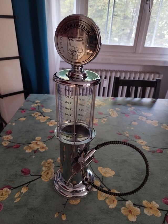 Simpatico dispenser per bibite a forma di pompa di benzina anni 50. Nuovo mai usato, intatto in tutte le sue parti. Grilletto erogatore funzionante. Materiale plastica.