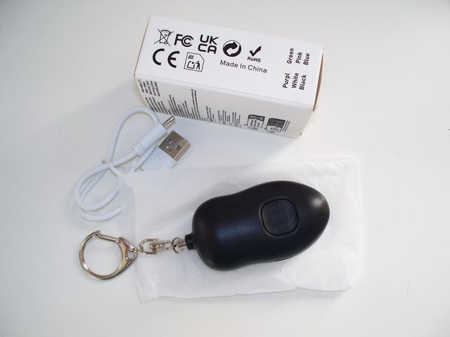 Dettagli del prodottoDispositivo di allarme compatto con portachiavi e cavo di ricarica USB.