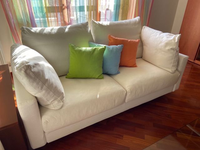 Dettagli del prodottoDivano “Cinova” in tessuto, tre posti (2,10 x 0,90). Cuscini con imbottitura in piuma d’oca, completamente sfoderabile. Trasporto a carico dell’acquirente. Misure del prodotto